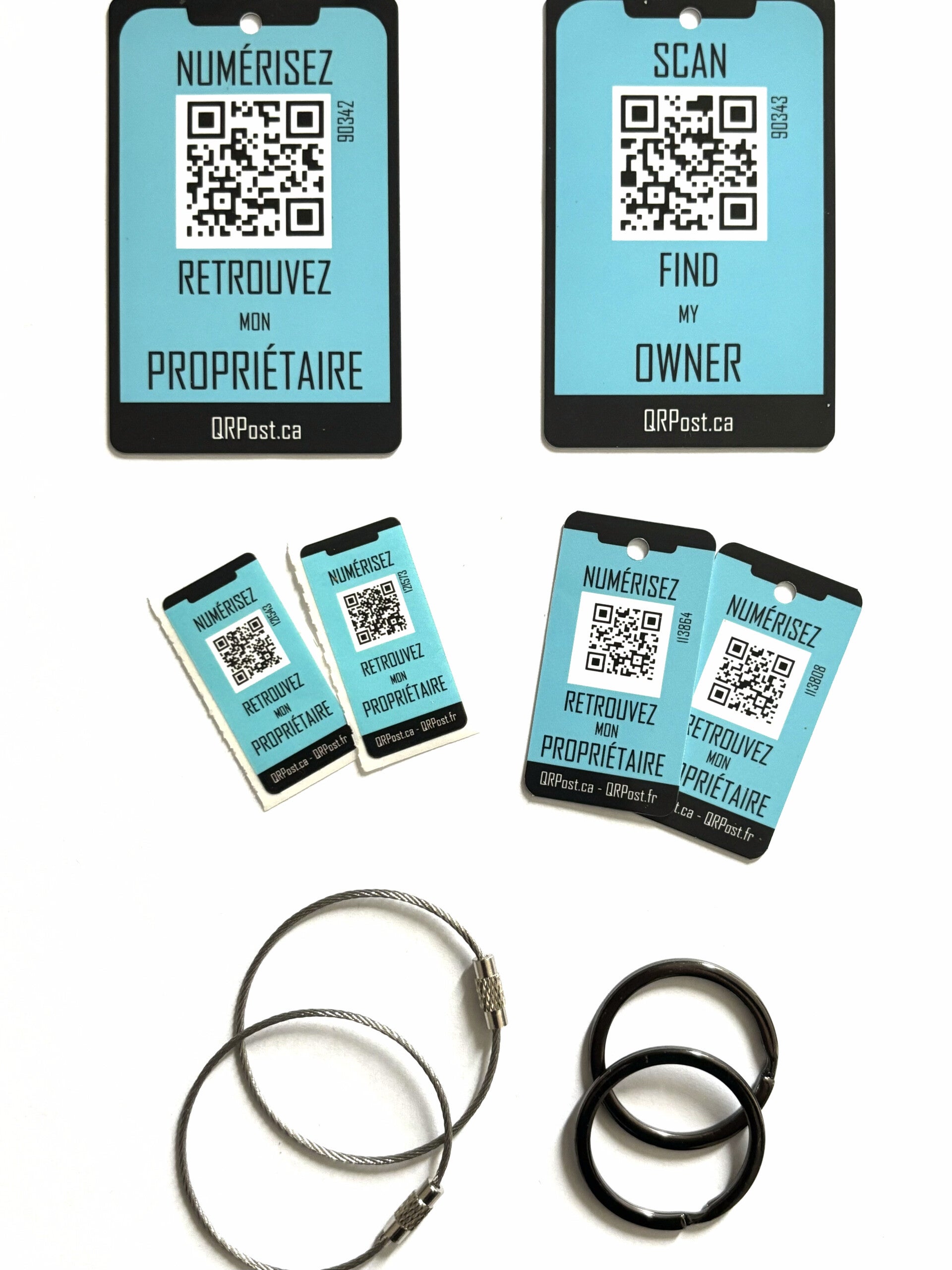 Inclus: 2 cartes bagages, 2 mini-cartes et 2 autocollants QR post.